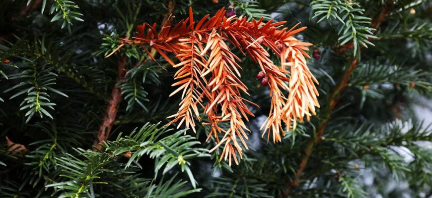 Весной при первых признаках пожелтения/иссыхания хвойного растения вы должны понять, ожог это или болезнь. Необходимо вести фотоотчёт очага болезни, чтобы понять прогрессирует ли он (увеличивается ли он в размерах).