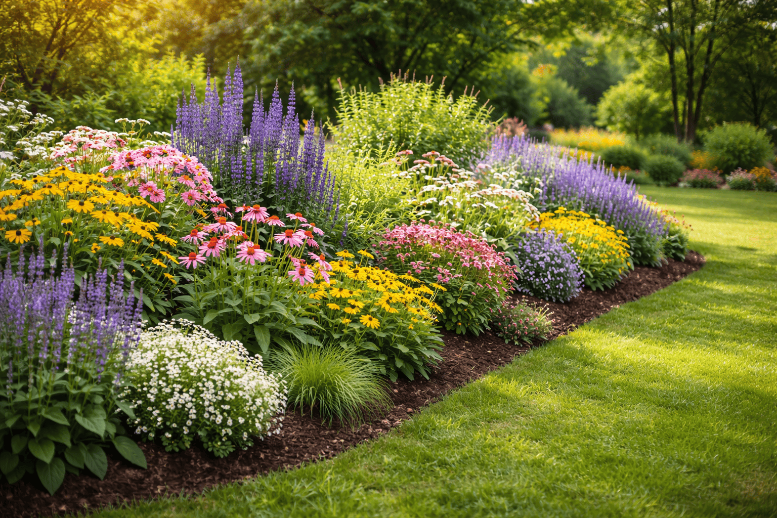 В нашей палитре — десятки проверенных многолетников: пышные пионы и лилейники, изящные хосты и астильбы, благородные ирисы и розы, а также декоративные злаки и хвойные для структуры.